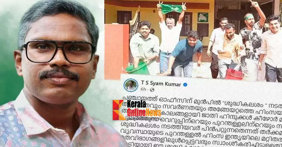 ഈ പ്രവൃത്തിയിലൂടെ ലീഗ് പ്രവര്ത്തകര് ഇന്ത്യയിലെ ദളിത് ജനവിഭാഗത്തെയും ഇന്ത്യന് ഭരണഘടനയെയുമാണ് അപമാനിച്ചിരിക്കുന്നതെന്നാണ് ടി എസ് ശ്യാം കുമാറിന്റെ വിമര്ശനം. പഞ്ചായത്ത് ഓഫീസിന് മുന്പില് 'ശുദ്ധികലശം' നടത്തിയ മുസ്ലിം ലീഗുകാരുടെ രാഷ്ട്രീയം അയിത്തവും സവര്ണതയും അങ്ങേയറ്റത്തെ ഹിംസയും പുലര്ത്തുന്ന രാഷ്ട്രീയം തന്നെയാണെന്ന് ഫേസ്ബുക്ക് പോസ്റ്റില് ടി എസ് ശ്യാം കുമാര് വിമര്ശിച്ചിട്ടുണ്ട്. കാലങ്ങളായി ജാതി ഹിന്ദുക്കള് കീഴോര് മനുഷ്യരോട് വെച്ചു പുലര്ത്തുന്ന വെറുപ്പിന്റെയും പുറന്തള്ളലിന്റെയും സാംസ്കാരിക രാഷ്ട്രീയമാണ് 'ശുദ്ധികലശം' നടത്തിയ ലീഗുകാര് പിന്പറ്റുന്നതെന്നും ശ്യാം കുമാര് കുറ്റപ്പെടുത്തുന്നുണ്ട്. ജാതി-വ്യവസ്ഥയുടെ പുറന്തള്ളല് ഹിംസ ഇന്ത്യയിലെ മറ്റിതര മതവിഭാഗങ്ങളിലുള്പ്പെട്ടവരും സ്വാംശീകരിച്ചിട്ടുള്ളതിന്റെ അനന്തരഫലം കൂടിയായി ഈ ശുദ്ധികലശത്തെ വിലയിരുത്തേണ്ടിവരുമെന്നും ശ്യാം കുമാര് ചൂണ്ടിക്കാണിക്കുന്നു.